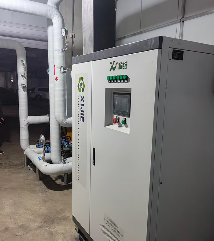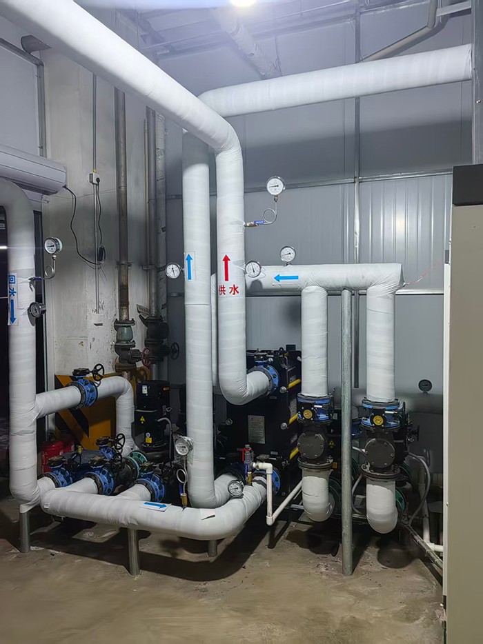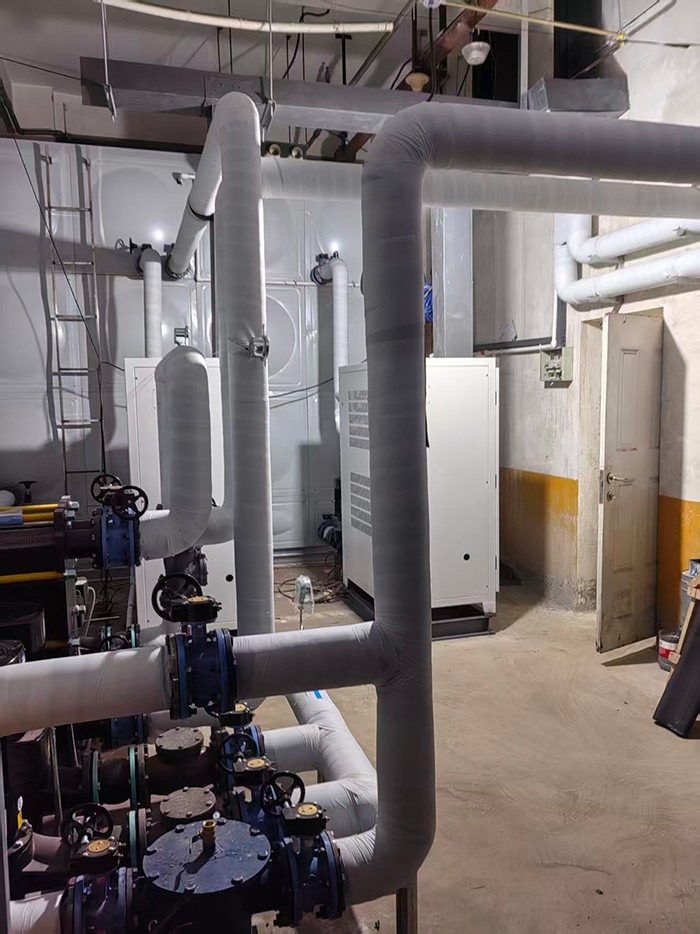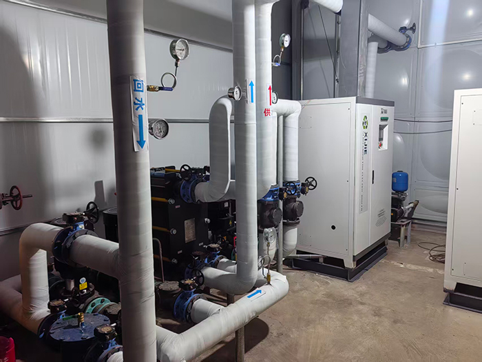 采用总功率:600KW 储能式控制机组(2台300KW),配合1个110m³的蓄热水箱。每晚利用谷电时段 进行储能加热,供暖效果良好。